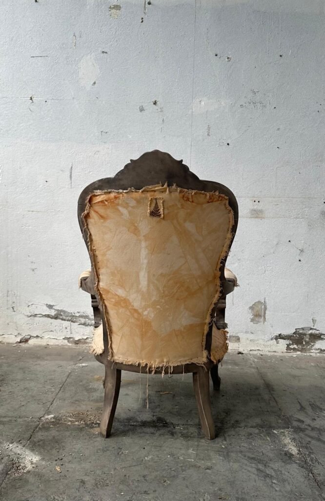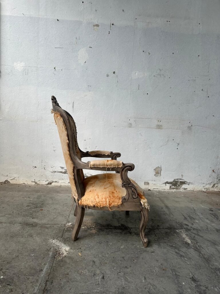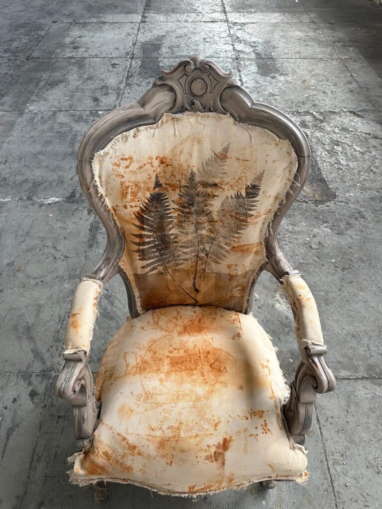 Questa poltrona d’epoca in stile Luigi XV è un’opera di alto artigianato che fonde il fascino dell’antico con la sperimentazione tessile contemporanea. La tappezzeria, realizzata interamente a mano, utilizza la suggestiva tecnica della stampa a ruggine per creare motivi botanici unici, impreziositi dal raffinato dettaglio di una piccola felce applicata sul retro dello schienale. La struttura mossa e intagliata accoglie una seduta volutamente autentica, dove le molle e i tiranti originali a vista celebrano la storia costruttiva del mobile. Un pezzo di straordinario impatto estetico, ideale per i collezionisti che ricercano l’anima nei dettagli e la bellezza nell’imperfezione colta.