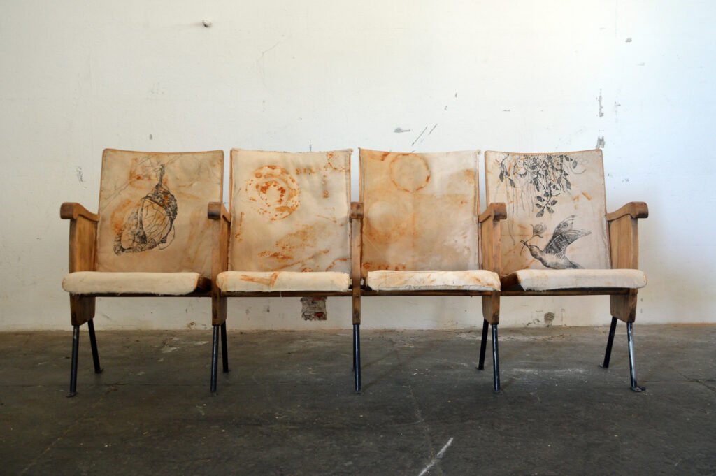 Un set di sedie da cinema vintage trasformate in un pezzo d’arte originale. Le stampe realizzate a mano su tessuto, che raffigurano motivi botanici e volatili, rendono ogni seduta un’opera d’arte. Gli schienali hanno inserti in lamiera effetto Corten, che donano un tocco industriale e moderno, creando un forte contrasto con l’eleganza degli intagli. Un pezzo unico e audace per dare carattere al tuo salotto o al tuo studio.